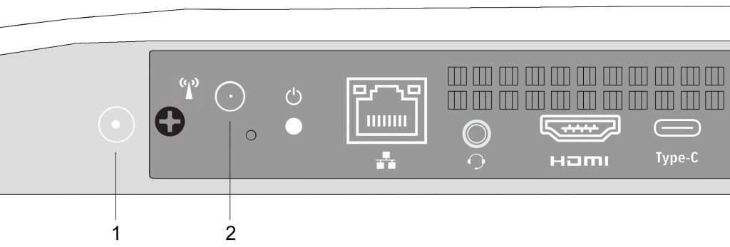 3. Verbinden Sie das kurze Stromkabel, welches aus dem Monitorhalter hinter dem Bildschirm kommt, mit dem Bildschirm (1). Die Buchse hierfür befindet sich neben der einen WLAN Antenne (2).